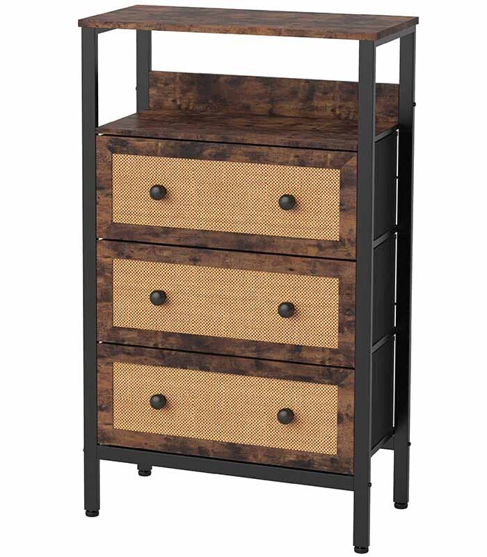 お部屋に合わせやすいラタン長とスチールの異素材を組み合わせた収納チェスト。